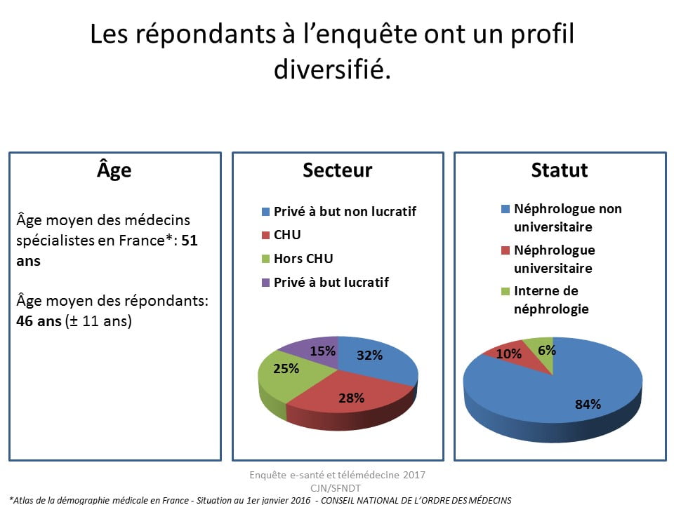 Les répondants à l’enquête ont un profil diversifié avec une moyenne d’âge de 46 ans +/-11 ans. Tous les secteurs sont représentés, le statut de néphrologue non universitaire est celui qui est majoritairement présent.