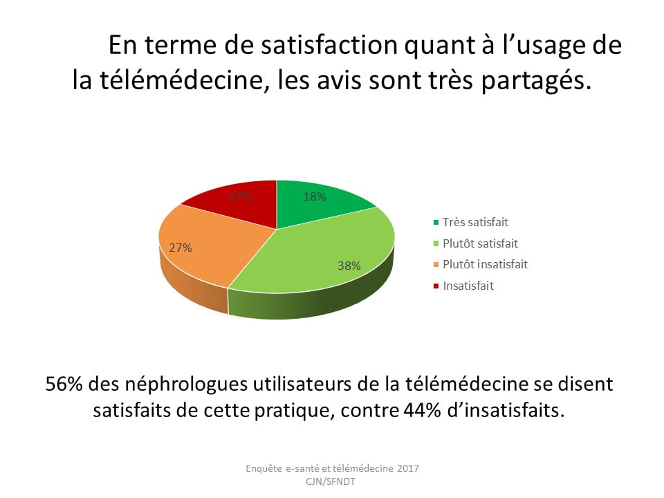 En terme de satisfaction quant à l’usage de la télémédecine, les avis sont très partagés avec globalement 56% de néphrologues satisfaits de cette pratique.