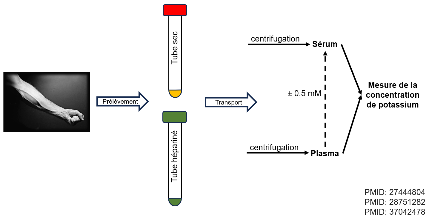 Le tube dans lequel le prélèvement sanguin est effectué a lui aussi son importance : on distingue les prélèvements sur tube sec (dont la centrifugation permettra d’extraire le sérum) des prélèvements sur tube avec anticoagulant (dont la centrifugation permettra d’extraire le plasma). On observe régulièrement des valeurs plus élevées de kaliémie sur sérum que sur plasma (de l’ordre de quelques dizaines de mmol/L). Les laboratoires tiennent normalement compte de ces variations lors du rendu des résultats.