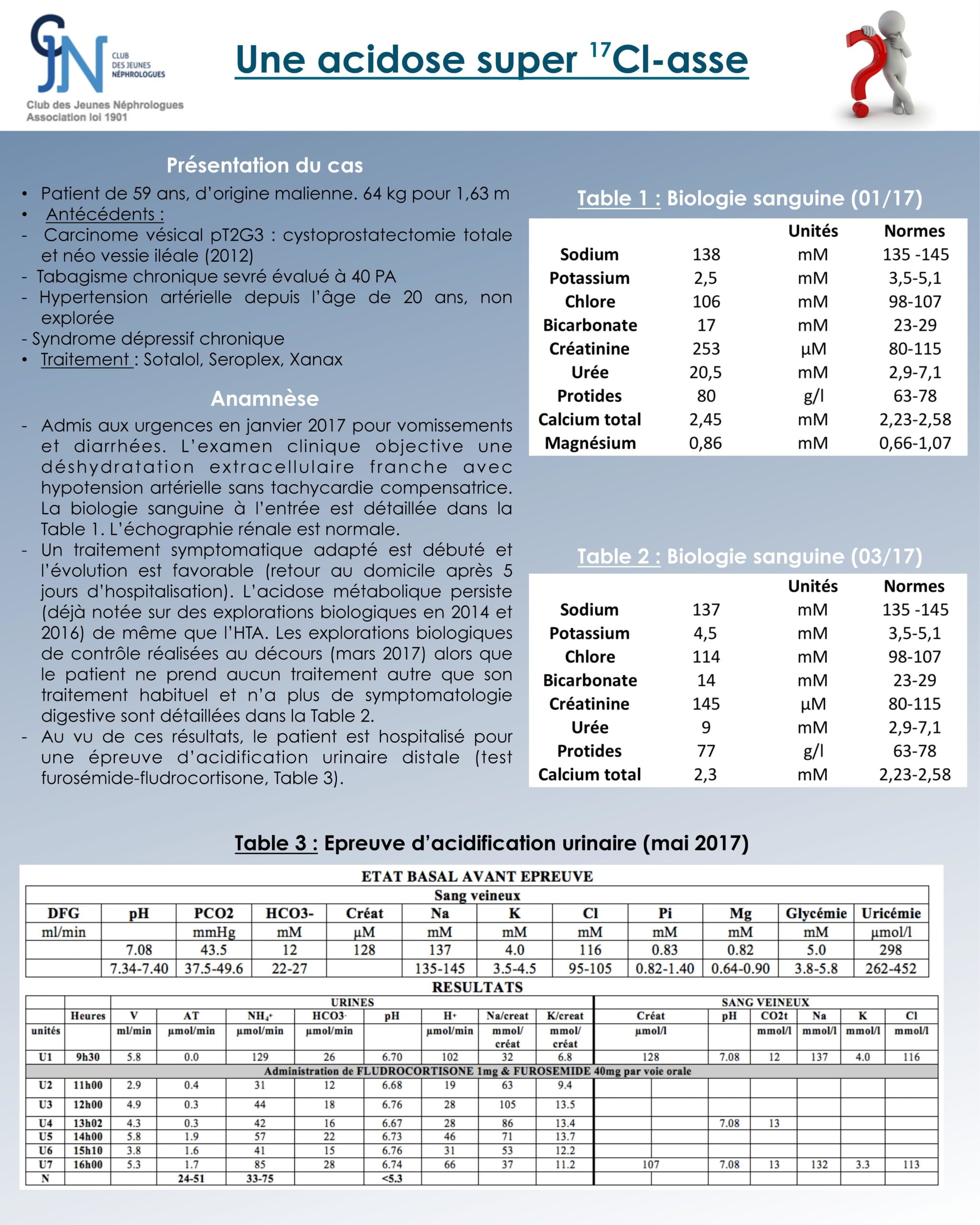 Le premier cas était celui d’un patient avec une acidose métabolique hyperchlorémique et des capacités d’acidification urinaire normale (épreuve d’administration de Furosémide-Fludrocortisone). Ce test permet d’évaluer l’action de l’aldostérone sur la sécrétion d’acide dans le canal collecteur (cellules intercalaires alpha). L’administration de Furosémide permet d’augmenter le débit sodé dans le canal collecteur, condition essentielle pour l’action de l’aldostérone (ou de la fludrocortisone). Chez ce patient, l’ammoniurie est normale mais contraste avec un pH urinaire non acide pendant l’épreuve et une bicarbonaturie vraie. Une acidose tubulaire proximale aurait pu être évoquée devant la bicarbonaturie mais dans ce cas, la synthèse/sécrétion d’ammonium serait altérée également.