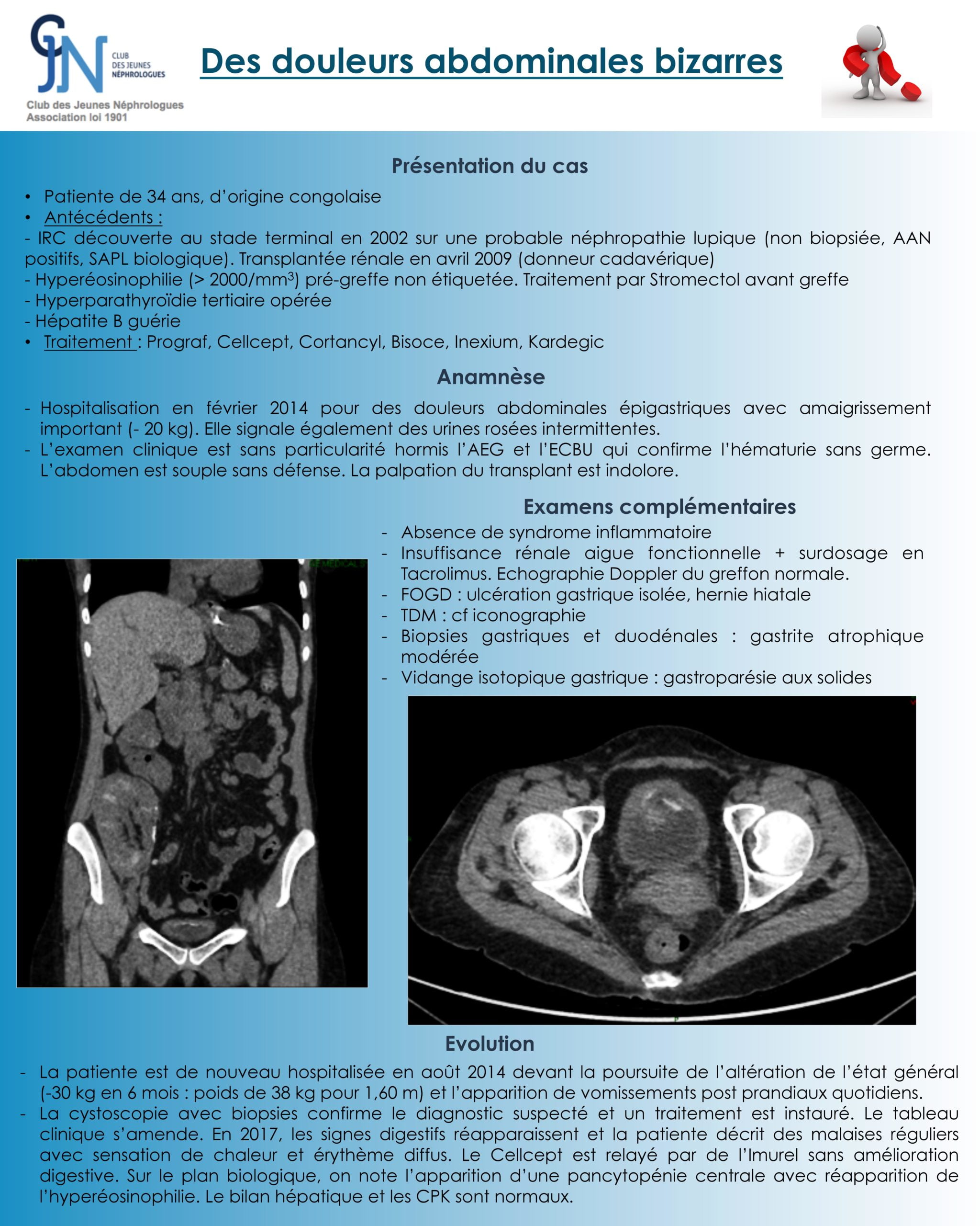 La deuxième patiente, transplantée rénale avait une symptomatologie digestive avec hématurie macroscopie intermittente et vessie porcelaine (cf. tomodensitométrie).