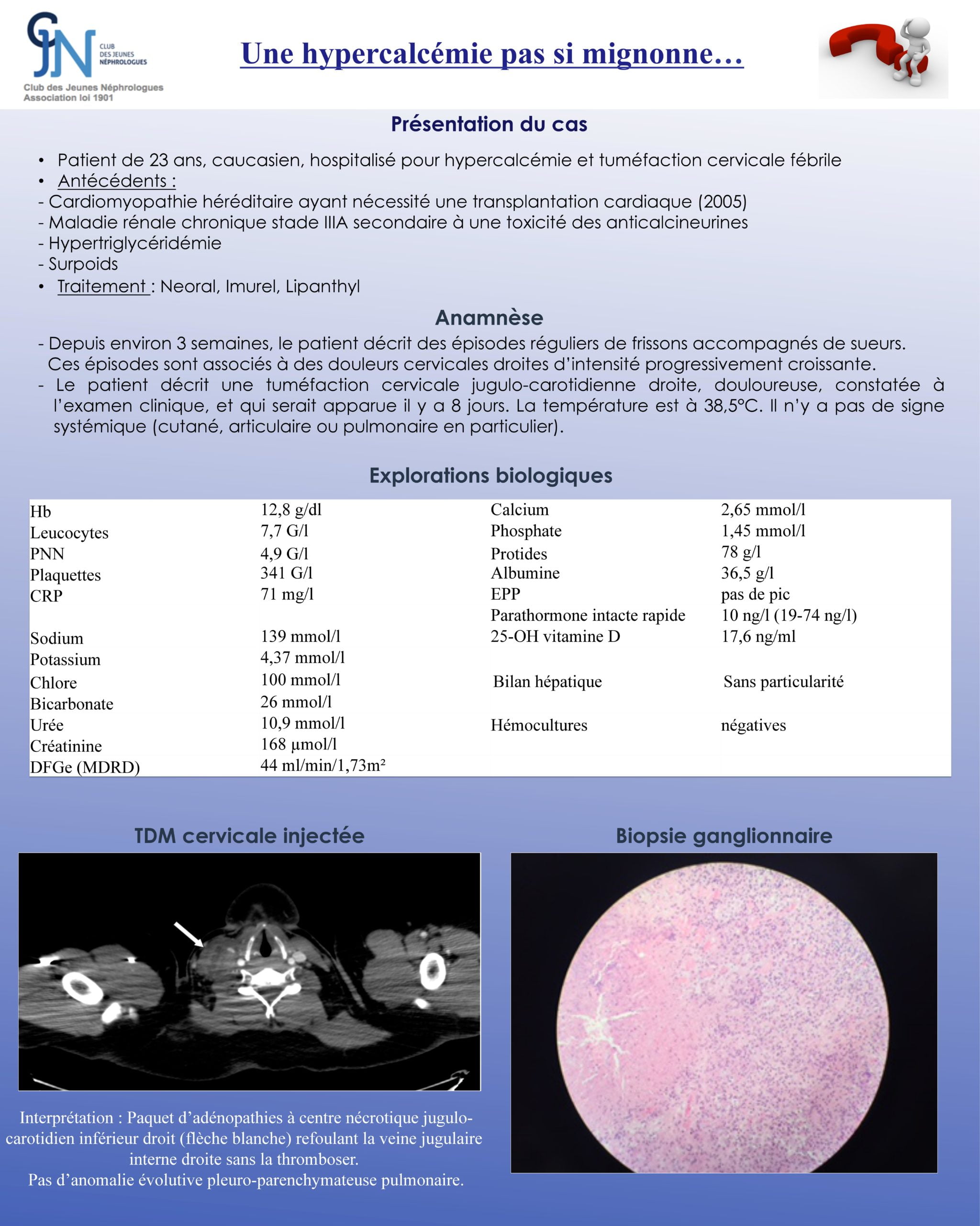 Le cas n°3 présentait le cas d’un patient avec adénite fébrile localisée, associée à une hypercalcémie extraparathyroïdienne. L’analyse histologique du ganglion objectivait des zones de nécrose avec des cellules géantes sans prolifération lymphomateuse ni argument pour une tuberculose. La PCR Bartonella henselae réalisée directement sur le ganglion prélevé a permis de confirmer le diagnostic de Bartonellose (maladie des griffes du chat). Un traitement par Doxycycline a été débuté (contre-indication théorique des macrolides, qui est le traitement de première intention, du fait du risque d’interaction médicamenteuse avec l’anticalcineurine). La maladie des griffes du chat est une pathologie sous diagnostiquée car elle peut s’amender spontanément chez l’immunocompétent. Le contact avec le chat (griffure, morsure, léchage de plaie) n’est pas toujours retrouvé. L’hypercalcémie est rare et secondaire à une hypercalcitriolémie (production de 1 alpha hydroxylase par les granulomes). Chez l’immunodéprimé, l’évolution peut être péjorative avec en particulier un risque d’endocardite.