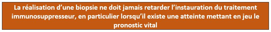 - d’apporter des informations pour la thérapeutique (orientation vers l’aphérèse, intensité du traitement immunosuppresseur). Elle ne permet toutefois pas, à elle seule, de guider le choix du traitement immunosuppresseur.