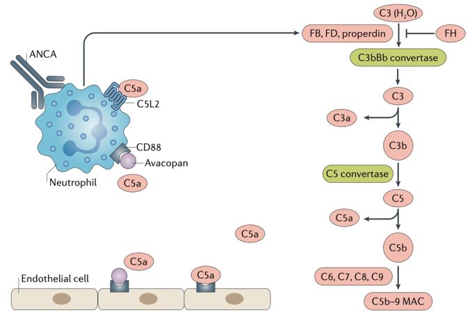 Les neutrophiles activés par les ANCA libèrent des facteurs (tels que la properdine), qui amplifient l’activation de la voie alterne du complément, générant de grandes quantités de C5a.